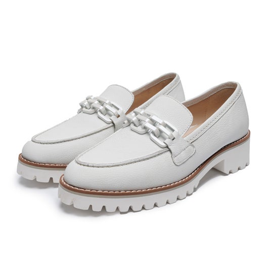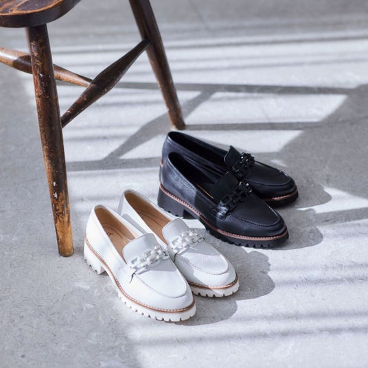 毎年大好評のボリュームローファーが、今シーズンはスクエアのチェーンによって一味違ったスパイスをプラス。春夏の足元を華やかに飾る「白」と秋冬から継続のベーシックな「黒」が登場します。とにかく軽量でクッション性に優れているため旅行シーンにも大活躍のきれい目シューズとしても人気。ローファーでありながらスニーカーのような履き心地を体感できます。