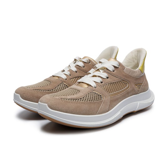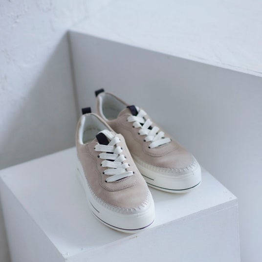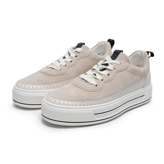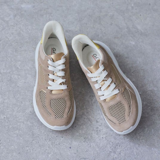 優しい印象のベージュのスエードレザーは足元を強調することなくどんなスタイルにも相性抜群。縁取りのステッチがナチュラルなカラーに立体感をプラスし、さりげなくアクセントに。アッパー、カウンター、アウトソールのブラックカラーがポイントとなり、クールな印象に仕上がりました。レザースニーカーをアップデートするなら、さりげない存在感を演出できるデザインがおすすめ。araならではのデザインとボリューム感で、さり気なく足元を飾ってくれる一足です。