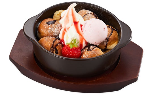 店内で揚げたてのドーナツは外はカリっと、中はふわっと。苺アイスを添えて、あつひやスイーツをお楽しみください。