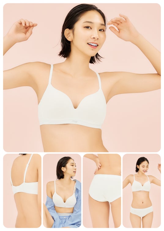 シンプルなモールドカップで薄手のアウターにもあわせやすく、アンダーバストのロゴ入りテープがsloggiらしいアクセントに。カラーは3色展開でホワイトのご用意もあり、ジュニアのファーストブラにもおすすめです。