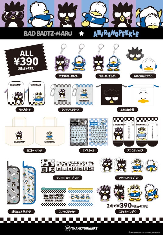「Be Smile, Be Kawaii」をテーマに、全品390円(税込429円)でバラエティ豊かなアパレル雑貨を揃える「サンキューマート」は、株式会社サンリオの人気キャラクター「バッドばつ丸」「あひるのペックル」の限定アイテムを全国のサンキューマート店舗で4月上旬より入荷次第販売開始いたします。