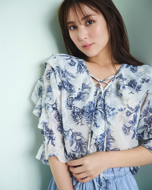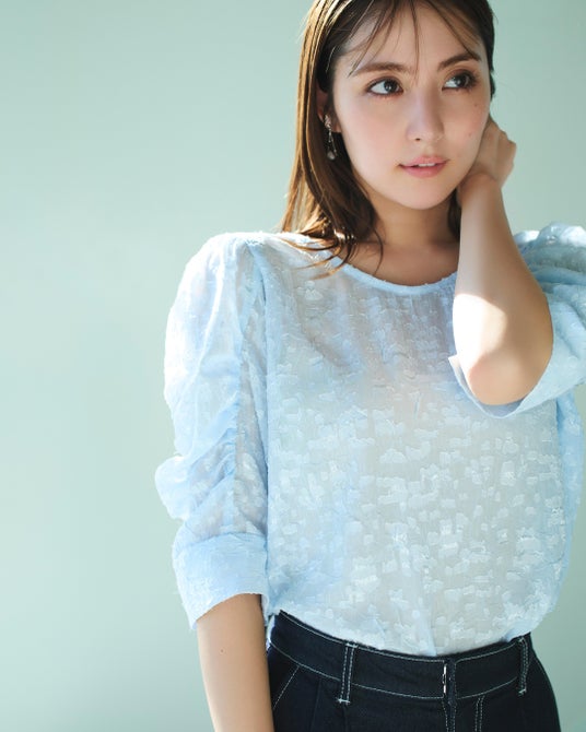 2.惜しみなくフリルをあしらったレディなブラウスは、ブルートーンで洗練させて