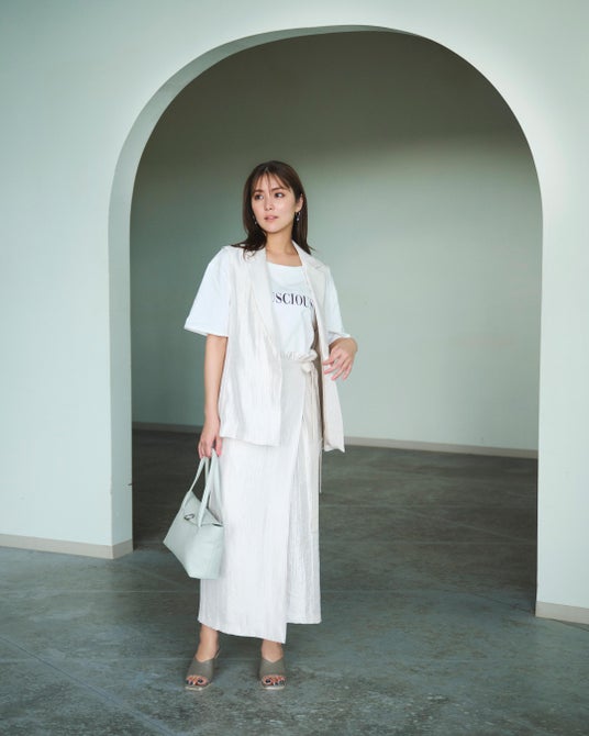 Gilet_¥25,300 / Skirt_¥19,800 / T-Shirt_¥9,680 / Bag_¥17,600 / Sandals_¥17,600