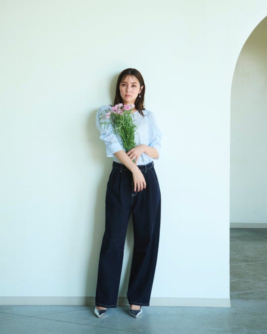 Blouse_¥16,500 / Denim_¥20,900 / Earrings_¥5,280 / Pumps_¥18,700