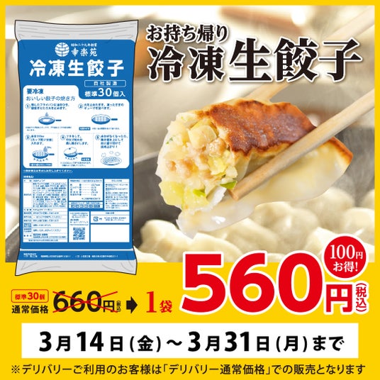 株式会社幸楽苑(本社:福島県郡山市)が運営する「幸楽苑」は、2025年3月14日(金)~3月31日(月)まで期間限定で、お持ち帰り「冷凍生餃子」(1袋標準30個入り)を、通常より100円お得な特別価格560円(税込)にて販売するキャンペーンを開催いたします。