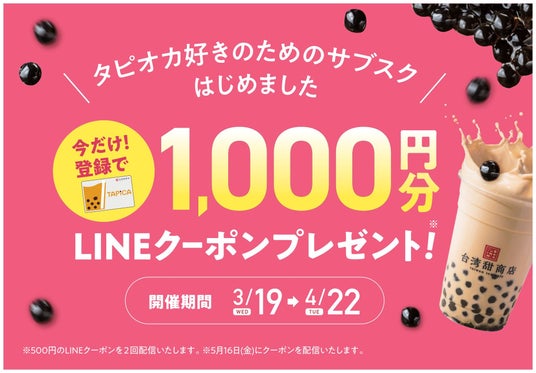【台湾甜商店】タピオカトッピングが4倍まで何度でも利用できるタピオカ定期券「TAPICA(タピカ)」入会で、必ず1,000円分のLINEクーポンがもらえるキャンペーンを開催!