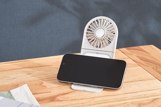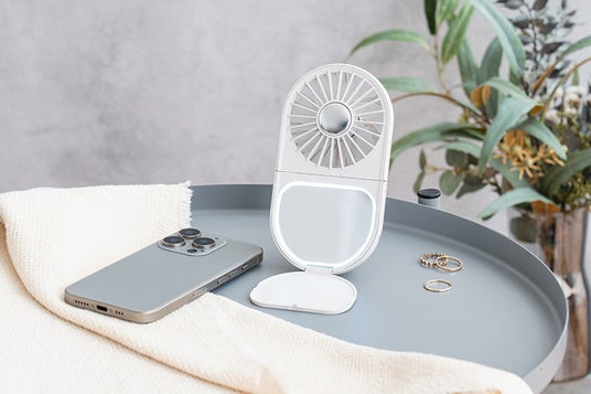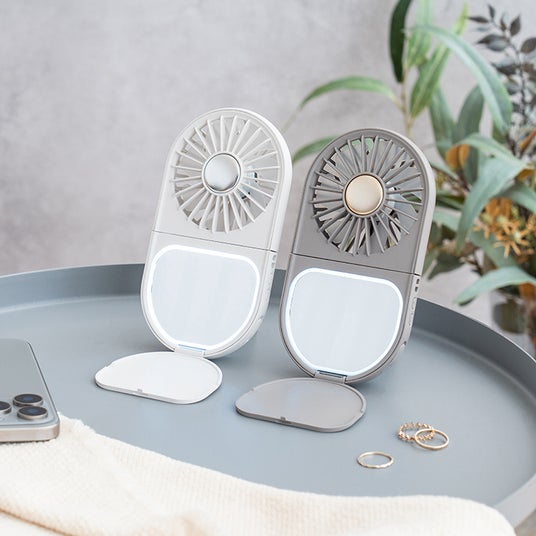 夏のお出かけ時やメイク直し、お風呂上りのスキンケアに便利なマルチファン。涼風で汗を抑え、化粧崩れ対策にも。ミラーには2段階調光が可能なLEDライトを搭載し、身だしなみチェックにも最適なアイテム。