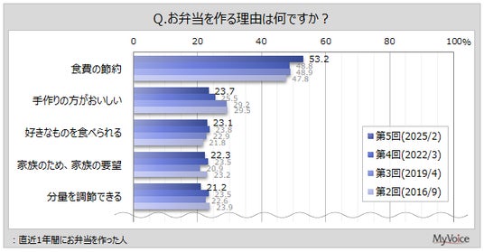 直近1年間にお弁当を作った人に、お弁当を作る理由を聞いたところ(複数回答)、「食費の節約」が53.2%で最も多く、以下「手作りの方がおいしい」「好きなものを食べられる」「家族のため、家族の要望」「分量を調節できる」が各2割強で続きます。