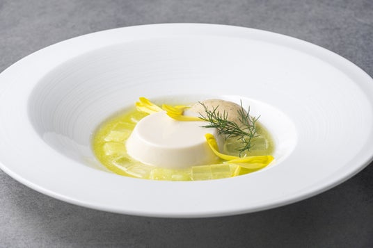 温前菜の「桜鱒とジャガイモのクレープ 鴨のカプチーノ」では、昆布茶で下味を施した桜鱒を軽く炙ってクレープ生地で覆い、鴨肉と鶏の出汁に生クリームを合わせカプチーノ仕立てでご用意します。もっちりとしたクレープに、桜鱒の上品な脂と甘みが「出汁香るカプチーノ」と見事なマリアージュを演出。塩味と酸味のアクセントとして「アブルーガキャビア」を添え仕上げました。ディナータイムのメインの一皿である「海苔を纏った仔牛肉のパイ包み焼き」では、日本伝統の調味料である塩麴でマリネした仔牛肉の中心にフォアグラとトリュフソースを忍ばせ、海苔で巻いて複合的なパイ包みに仕立てます。付け合わせには「木の芽味噌」で和えた季節の野菜を彩り良く添え、マデラソースでお楽しみいただけます。デザートは「和三盆糖」を使用した「アーモンドのブランマンジェとメロンのソース 煎茶のアイスを添えて」をご用意します。初夏から旬を迎えるメロンを使用したソースと、煎茶風味のアイスを添え「菊の花びら」をあしらい「和」を演出しました。