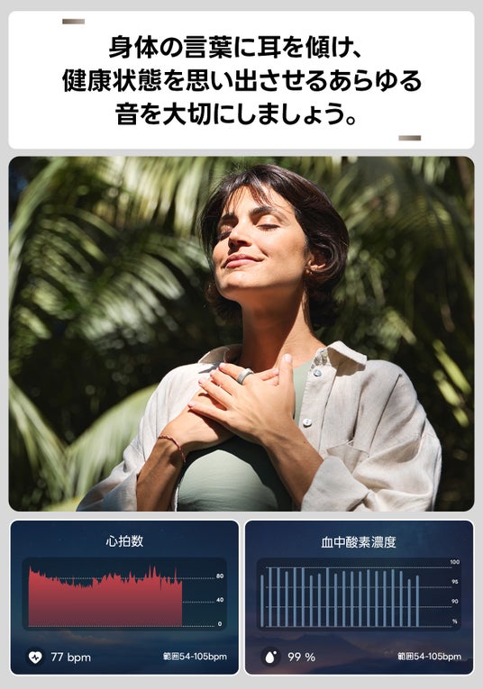 心拍数、血中酸素濃度、体温をリアルタイムでチェックし、心臓血管の健康、酸素供給、体温の微妙な変化を常に把握します。