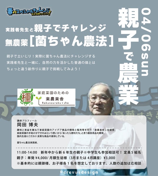親子で無農薬農法を体験し、自然に触れ合いながら農業を学ぶ機会を提供。親子の絆を深め、お子さまの好奇心を育てる貴重な体験です。