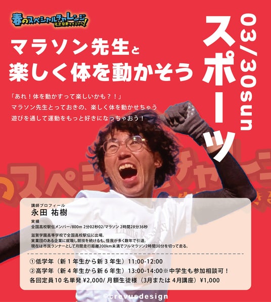 フルマラソンの達人と一緒に運動を楽しみながら、体力や協調性を高める特別体験。スポーツを通じて、お子さまの成長を支援します。