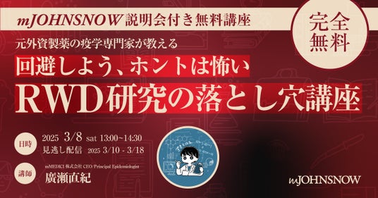 2025年3月8日(土)に、当社CEO廣瀬直紀が【完全無料:mJOHNSNOW説明会付き公開講座】-元外資製薬の疫学専門家が教える-回避しよう、ホントは怖いRWD研究の落とし穴講座を開催いたしました。参加者480名・満足度94%と大盛況で終了しました。18日(火)までの期間限定でオンデマンド配信を公開いたします。