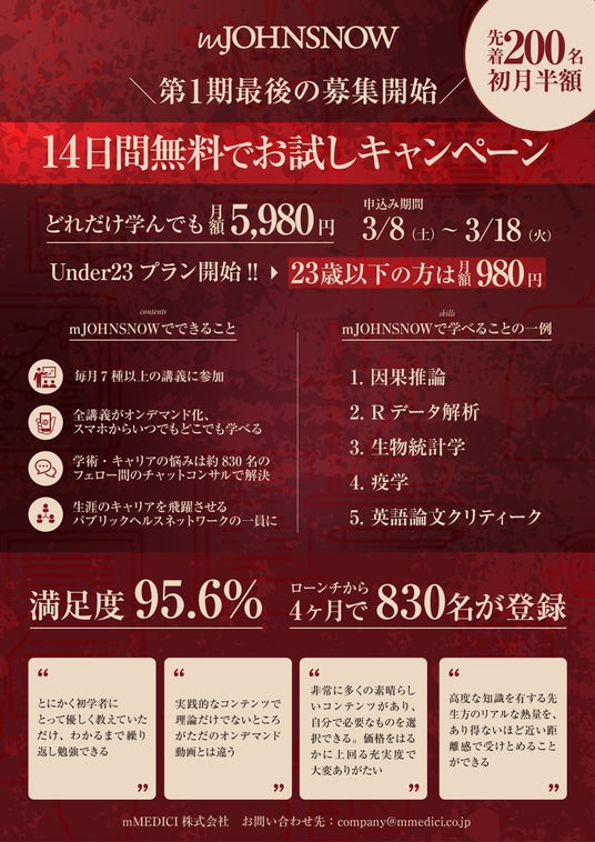mMEDICI株式会社(代表取締役:廣瀬 直紀、以下「当社」)は、2024年10月よりヘルスケア人材が研究手法を学ぶためのオンラインスクールmJOHNSNOWをローンチしました。ローンチから4ヶ月で現在のフェロー数が約830名を超え、全世界から産官学にわたってヘルスケアのスペシャリストが集う日本最大級のヘルスケアオンラインスクールとなっています。