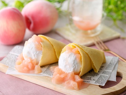 食後のスイーツでは、作って楽しい♪セルフメイクスイーツの『クレープ』にて「ごろっと果実の白桃ソース」が期間限定にて仲間入り!