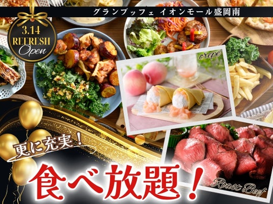 【3/14リフレッシュOPEN!!】和洋中の食べ放題‟グランブッフェ イオンモール盛岡南”がリフレッシュOPEN!期間限定の「スイーツ」や「自家製ローストビーフ」などの新メニューで更に充実な食べ放題!