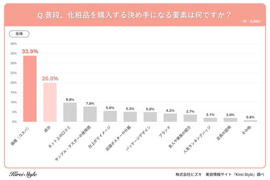 全国の20代~50代の女性2,000人を対象に、「普段、化粧品を購入する決め手になる要素は何ですか?」というアンケートを実施したところ、最も多かった回答は「価格(コスパ)」で33.9%となりました。次いで、「成分」が20.0%、「ネット上の口コミ」が9.8%と続く結果となりました。また、「その他」として、「自分の肌に合うか」、「効果」などの回答が得られました。