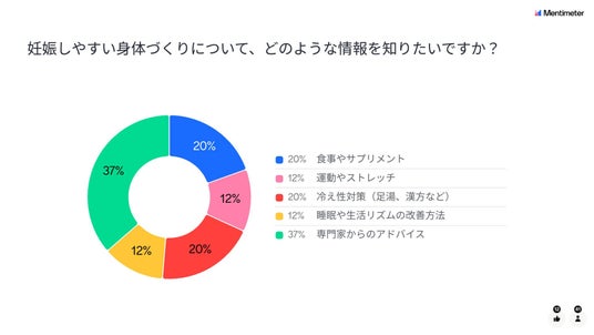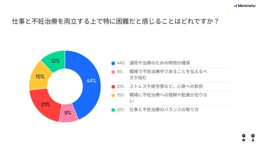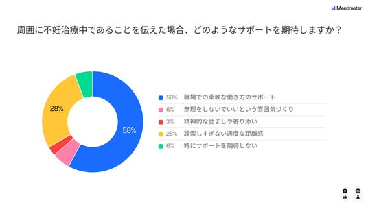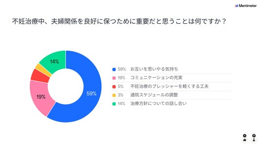 また、視聴者アンケートで上位3つに挙げられた「お互いを思いやる気持ち(58%)」「コミュニケーションの充実(19%)」「治療方針についての話し合い(14%)」の回答を受け、川井先生は「うまく病院を使ってくれたらと思う。日常生活の中で不妊治療の話をすることはお互いにとってプレッシャーになる部分がある。僕ら医師ができることは『夫婦で一度お話を聞きに来てください』とお伝えすること。治療の方向性や伝えるべき事など、お力になれることがあれば伝えていくこともできる」と語り、夫婦間の思いやりや話し合いを支援するために医師をうまく使っていただきたいとご説明いただきました。