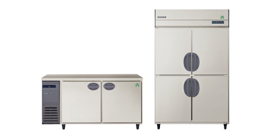 ヨコ型業務用冷蔵庫は幅・奥行・温度帯違い・センターフリー・1/1ホテルパン仕様の30機種の合計50機種がバリエーション追加。従来の一定速フロン機種と併売です。