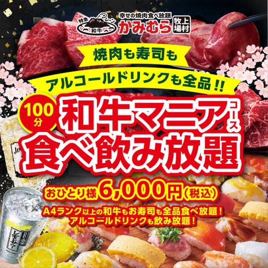ワタミ株式会社(東京都大田区、以下ワタミ)と国内有数の和牛生産者であるカミチクグループ(鹿児島県鹿児島市)との合弁会社、ワタミカミチク株式会社(東京都大田区、以下ワタミカミチク)が展開する「かみむら牧場」は、2025年3月17日(月)より2025年4月20日(日)まで期間限定の特別コースとしてA4ランク以上の和牛も牛タンもお寿司も食べ放題でお楽しみいただける「和牛マニアコース(100分)」に、アルコールドリンクの飲み放題コースをセットにした「和牛マニア食べ飲み放題コース」を、おひとり様税込6,000円で販売いたします。