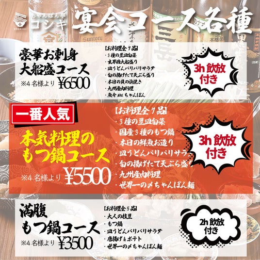 ご宴会コース幹事様お一人様分最大6500円が無料に!歓送迎会シーズンちゃんぽん酒場本気の宴会コースご優待キャンペーン