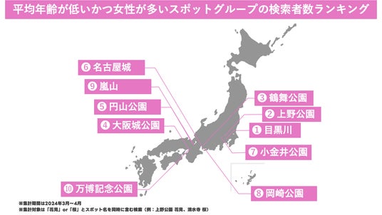 平均年齢が低めの女性に人気のスポットは「目黒川」、平均年齢が高めの男性に人気のスポットは「吉野山」