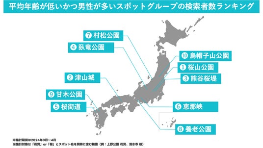 女性の検索者が多いスポットは都市部などアクセスが比較的良い地域に集中している一方で、男性の検索者が多いスポットは都市部からやや離れた場所に多いことから、男性は車やバイクを利用してお花見を楽しむ傾向がある可能性も考えられそうです。