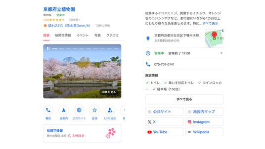 「Yahoo!検索」では「地名 花見」などと検索すると、周辺エリアのお花見スポットの桜の種類、開花情報、公式サイトなどの詳細情報が表示されます。開花情報は「つぼみ」「咲き始め」「5分咲き」「7分咲き」「満開」「散り始め」「終わり」の7段階で確認でき、各スポットのアクセス方法も表示されます。