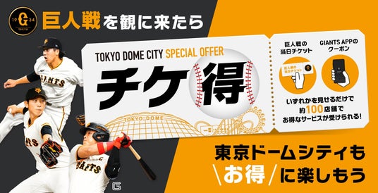 東京ドームでの巨人戦当日チケット提示、ジャイアンツ公式アプリ「GIANTS APP」に配信されるクーポン提示で東京ドームシティ内、約100店舗の様々なディスカウントサービスが受けられる『TOKYO DOME CITY SPECIAL OFFER』。