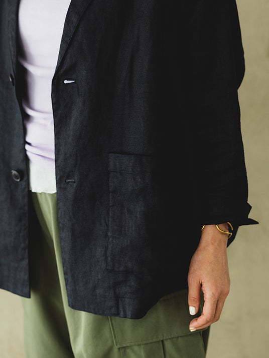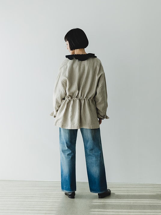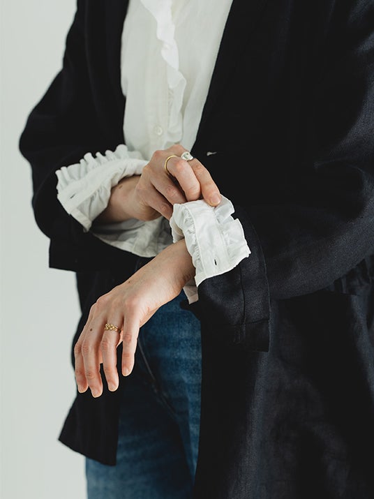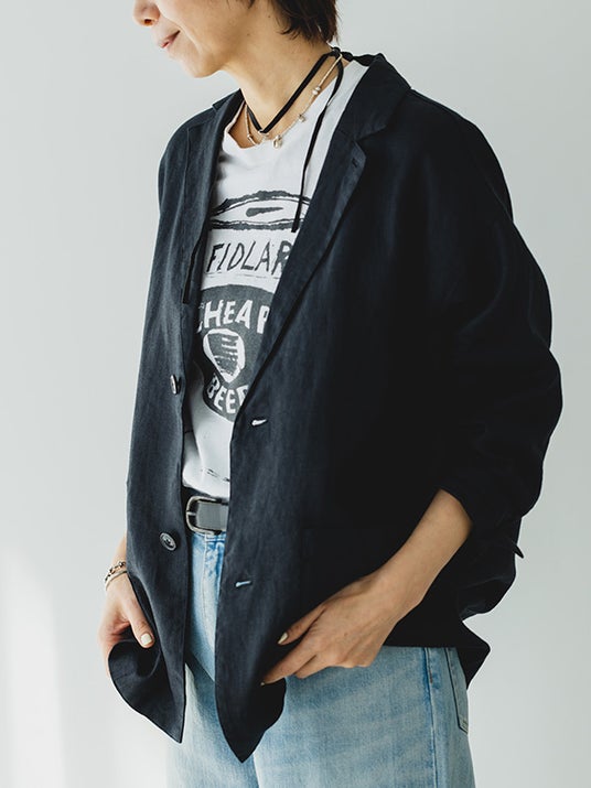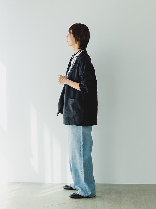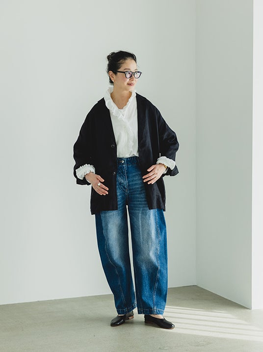 スタッフ奥田: このテーラードジャケットは、ライトベージュ・ブラックともに、デニムにすごく似合うので、ぜひ試していただけたら嬉しいコーディネートです。特にブラックは、フリルブラウスのような⽢さのあるアイテムとの掛け合わせが好きです。ほどよくピリッと締まった印象を加えてくれるので、一枚あると何かと頼れます。