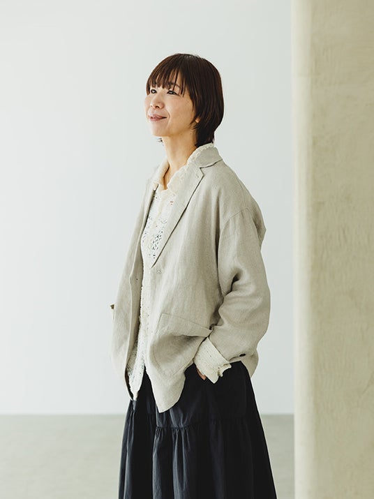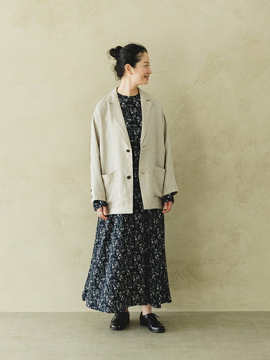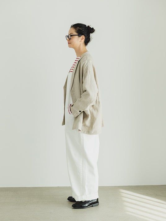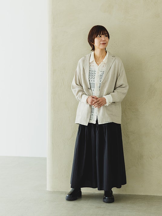 スタッフ奥田: 40代になってから、実はファッションに迷う場面が増えました。20代や30代の頃によく着ていたシンプルな洋服をそのまま着るだけだと、物寂しく感じたり、少しだらしなく見える気がしてしまったり。そんなとき、“ジャケット”が一枚あるとすごく重宝するなと実感していました。このままだとカジュアルすぎるかもという時に、さらっと一枚⽻織るだけで、大人らしさやキチンとした感じにまとめてくれるんです。