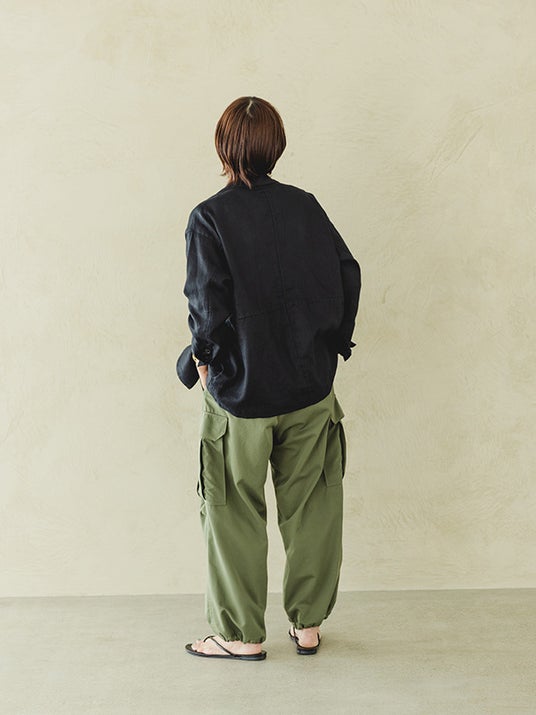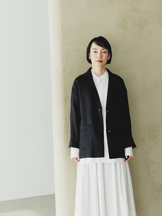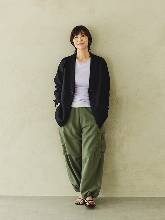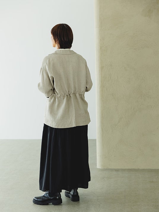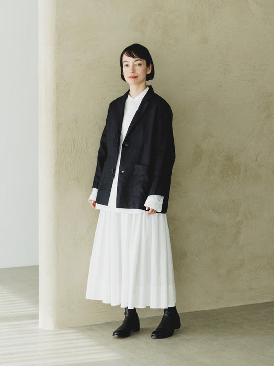 佐藤さん: ハリのある生地ですが、厚みはあえてやや薄手にしていて、ブラックでも重たすぎる感じはないかなと思います。こんなふうに淡いパープルと合わせても、素敵ですね! さらっとした肌触りだから、夏の冷房対策にも重宝しそうだなと思っています。