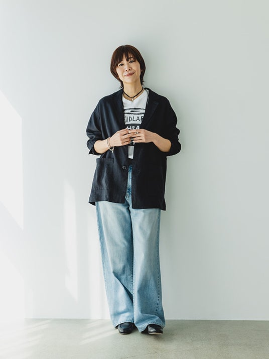 佐藤さん: 大好きなブラックは、今回も⽋かせないカラーでした。ロゴTシャツとデニムのようなカジュアルなコーデにも合わせやすいです。品と抜けのバランスがいいのも、気に入っているポイントです。肩線の位置を少し落とすことで、よい塩梅で力が抜けた印象になりました。