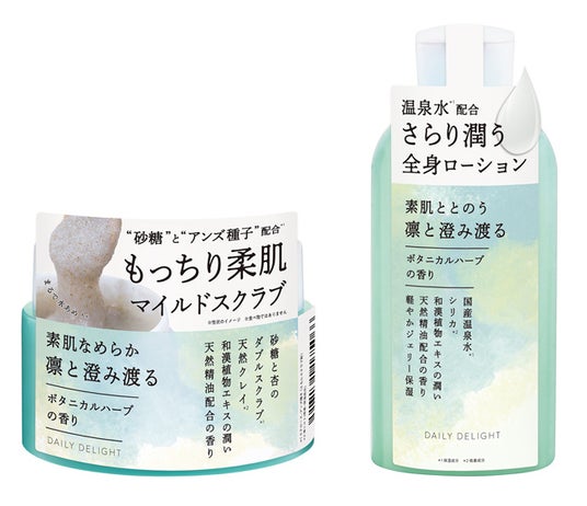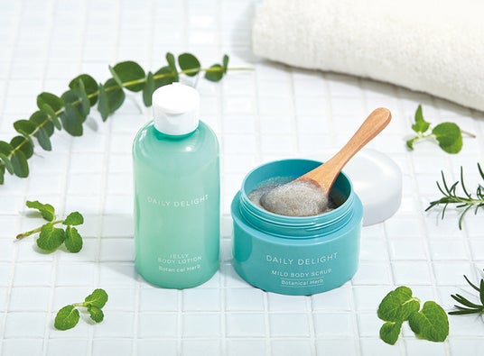 心地よいアロマが魅力の『デイリーディライト』のビューティーシリーズから新発売の「マイルドボディースクラブ」と「ジェリーボディーローション」は、スパのようなリフレッシュ感を自宅で愉しめるバス&ボディーアイテム。