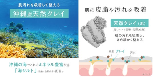 沖縄の海でとれるミネラル豊富な「海シルト」(吸着・整肌成分)は細かい粒子で余分な皮脂をやさしく吸着、肌を整えツルツルに