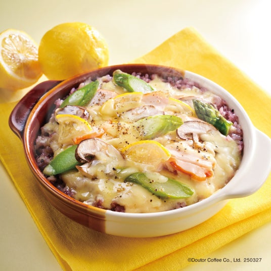 黒米やもち麦をブレンドした国産コシヒカリの雑穀ご飯に、香ばしいスモークチキン、アスパラ、マッシュルームを爽やかなレモンホワイトソースで合わせたドリアです。