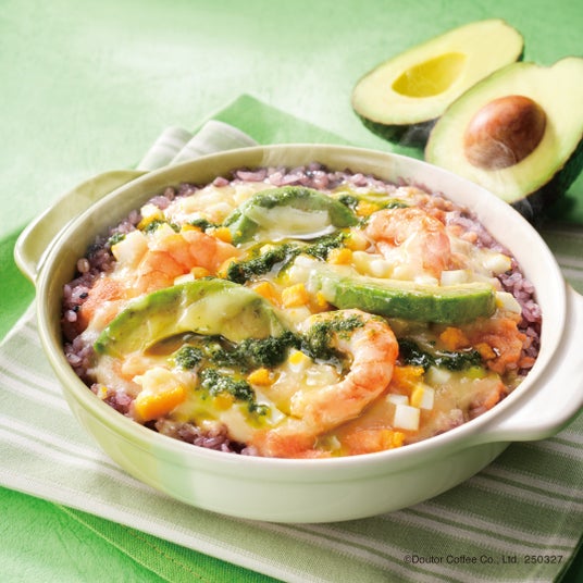 黒米やもち麦をブレンドした国産コシヒカリの雑穀ご飯に、ぷちぷちとした食感が楽しめる明太子と、まろやかな味わいのホワイトソースを合わせました。さらに、大葉ソースの爽やかな風味が広がる色鮮やかなドリアです。具材には、ぷりっとした海老とクリーミーなアボカドをトッピング。仕上げに彩り豊かなミモザ風のゆで卵を添え、見た目にも華やかな一皿に仕上げました。