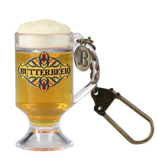 バタービールのビールジョッキ型のキーリングです。ビールジョッキの中にはバタービールをイメージした液体が入っており、もこもこした泡の部分は立体で表現しています。付属のバタービールのロゴのプレートがポイントです。