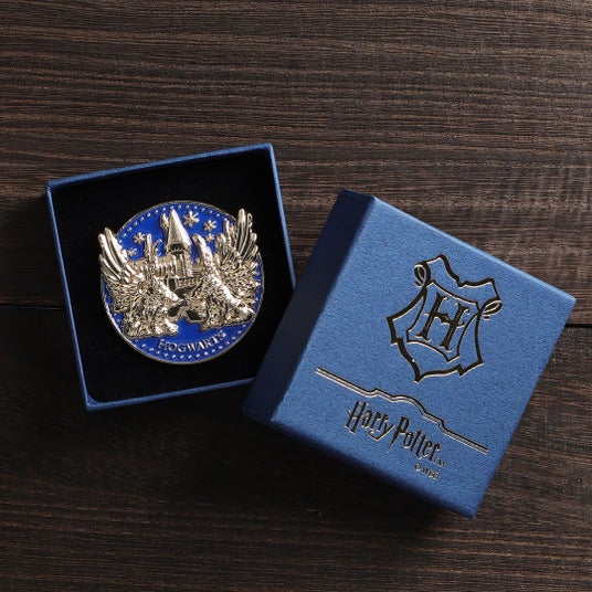 ハリー・ポッター マホウドコロ 栄公園店でしか購入できないコイン型のピンバッジです。栄公園店の店内ではホグワーツ城の入り口にある羽イノシシのモニュメントを設置していることから、ホグワーツ城と羽イノシシを用いた門からホグワーツ城を眺めたときのようなワクワクするデザインになっています。裏には2店舗目のマホウドコロの店舗であることを表す星の刻印がふたつ押されています。