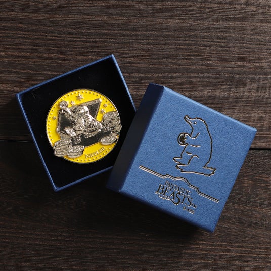 ハリー・ポッター マホウドコロ ランドマークプラザ店でしか購入できないコイン型のピンバッジです。店内装飾のひとつであるトランクを用いた部屋からイメージした、映画『ファンタスティック・ビースト』のニュートのトランクとキラキラしたものが大好きな魔法動物ニフラーがコインを持っている姿がデザインされています。裏には3店舗目のマホウドコロの店舗であることを表す星の刻印が三つ押されています。