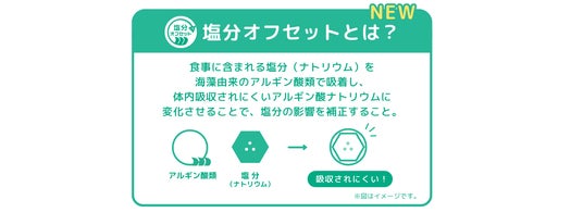 塩分オフセット技術とは、食事に含まれる塩分(ナトリウム)を海藻由来のアルギン酸類で吸着し、体内吸収されにくいアルギン酸ナトリウムに変化させることで、塩分の影響を補正する技術のことを指します。
