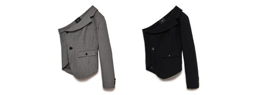 ジャケットをずらして着ているように見える、ワンショルダーデザインのジャケット。ウエストがシェイプされたシルエットでモードな印象です。