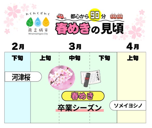 南足柄市観光協会のインスタグラムや市公式SNSなどで春めきの開花状況をお知らせします。