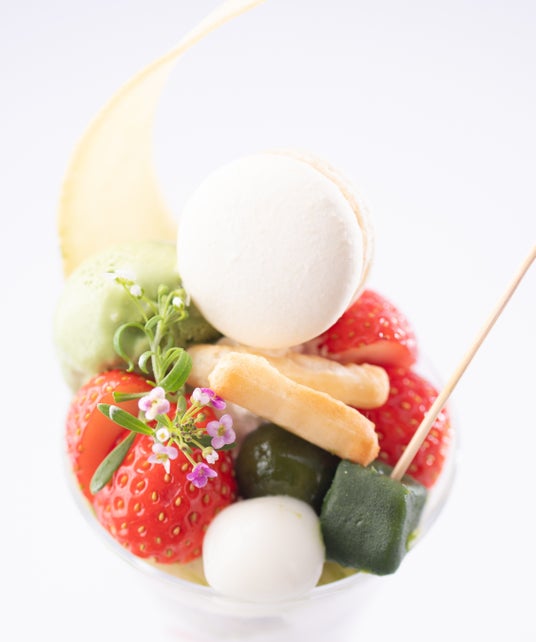 地元三重の「お茶漬けあられ」と呼ばれる素朴な味の田舎あられを添え、甘さを引き立てます。伊勢茶の生チョコレートとアイスやシフォンケーキ、わらび餅、粒あん、栗など様々な素材をグラスに重ね、甘酸っぱいフレッシュないちごで華やかさを表現。食べ進めるごとに異なる食感と豊かな伊勢茶の風味が広がり、最後まで飽きることなく楽しめる、新緑の季節にぴったりな和スイーツです。