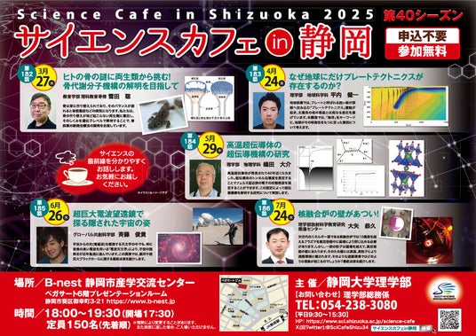 本イベントは、2006年より39シーズンに渡り継続的に実施し、市民の皆様にご好評いただいております。シーズン40では、静岡大学の教員が生物学、化学、地球科学、物理学の各分野の基礎科学の最先端の研究現場の様子を分かりやすくご紹介いたします。