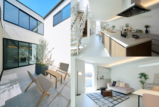 ・特徴:建物がコの字に囲むタイルデッキの中庭は、アウトドアグッズやプロジェクターなどを設置して趣味や家族との時間を楽しんでいただけます。LDKには中庭側の大開口と吹抜からの光が降り注ぎ、明るく開放感のある空間となっております。アイランドキッチンとダイニングテーブルは横並びで、食事の準備や片付けがしやすく、キッチンの奥には収納力十分なパントリーも設けております。ランドリールームを兼ねた脱衣室や、ファミリークローゼットが隣接する洗面スペースなど、水回りは家事や身支度がスムーズにできる構成になっております。2階にはフリースペースや広々としたバルコニーを設け、子どもの遊び場や趣味のスペースなど暮らしに合わせて活用いただけます。