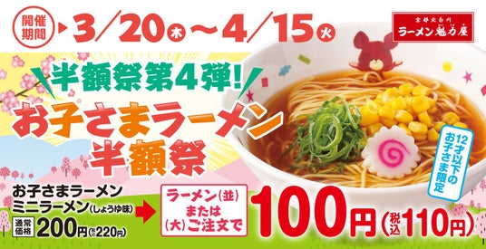 半額祭の第4弾として、お子さまの新たな門出を祝い「お子さまラーメン半額祭」を3月20日(木・祝)より開催いたします。