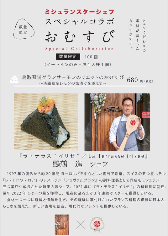 ミシュランスターシェフの手作りおむすび!第八弾は初の奈良県とのコラボ!3年連続ミシュラン一つ星の名店『ラ・テラス “イリゼ”』鷦鷯進シェフが作るフレンチおむすび!3月14日より完全数量限定で提供開始