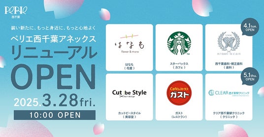株式会社千葉ステーションビル(本社:千葉市中央区、代表取締役社長:弭間 俊則)が運営するJR西千葉駅直結の「ペリエ西千葉 アネックス」(以下、アネックス)が、3月28日(金)にリニューアルオープンします。また、オープンを記念して、「リニューアルOPENイベント」を実施します(4月6日まで)。