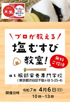 株式会社天塩(本社:東京都新宿区、代表取締役社長:鈴木 恵)は、4月6日「天塩 塩むすびの日」に服部栄養専門学校(東京渋谷区)にて親子参加型イベント「プロが教える塩むすび教室」を開催します。当日は塩むすびづくりや親子で塩づくり体験などをお楽しみいただきます。